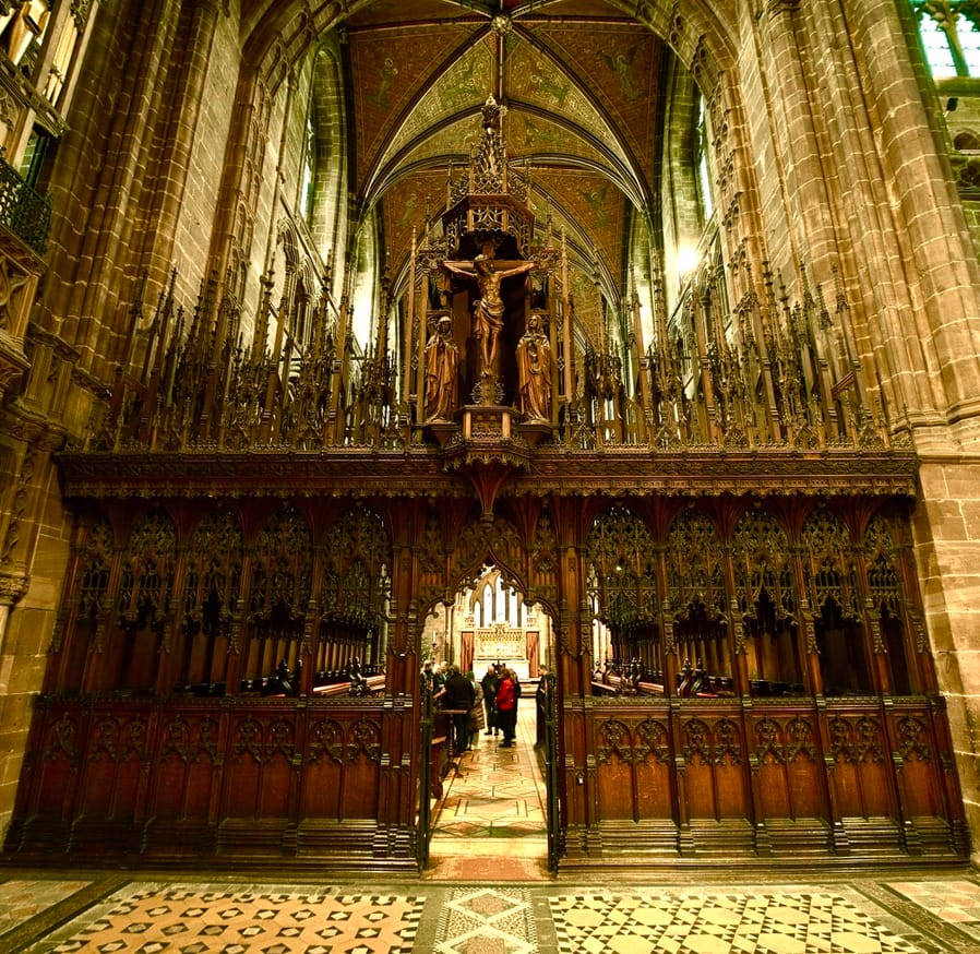 The Rood screen entering the Quire looking east towards the Lady Chapel and west towards the west door.
