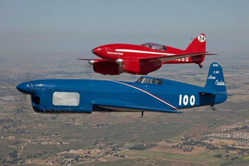 Top-Down L-R: Miles M3 Falcon, Avions C460 Caudron AND de Havilland D-88 Comet Racer, Red Arrows Formation in Folland Gnats, Polish AirForce MiG-17, Russian Air Force MiG-15, Glider on-tow, Jodel D-140 Mousquetaire with Skiis.