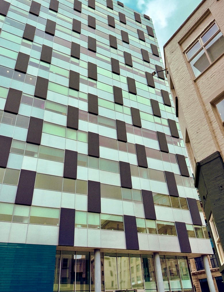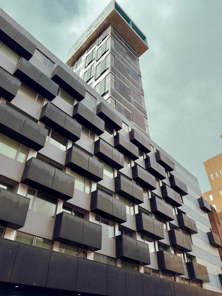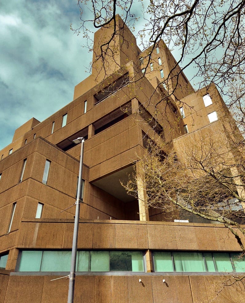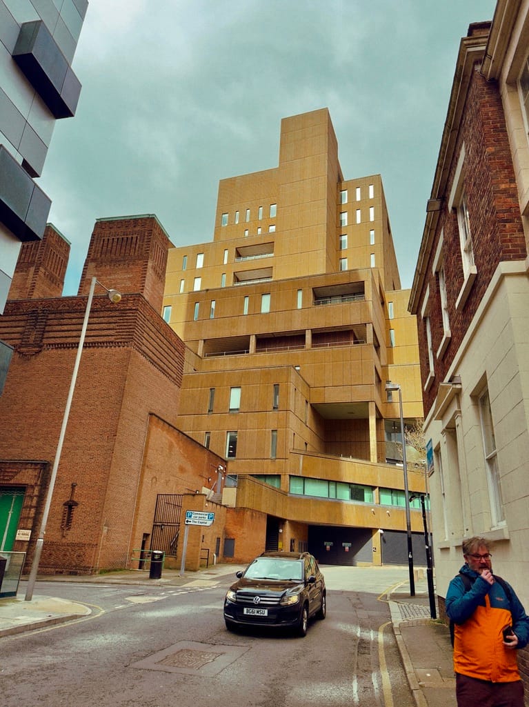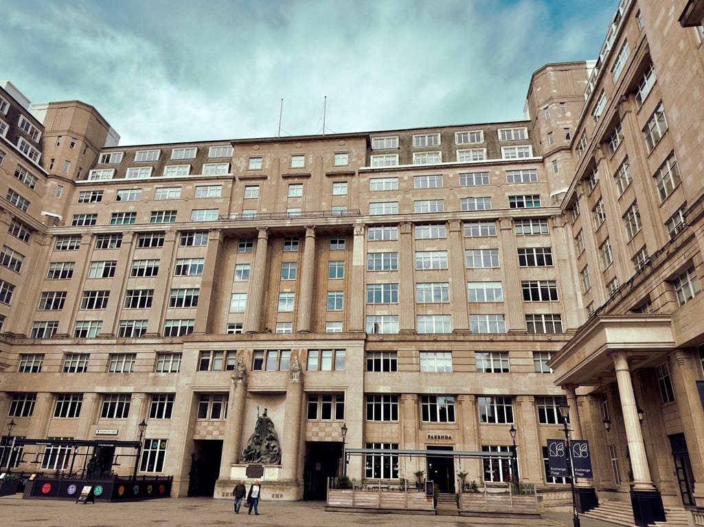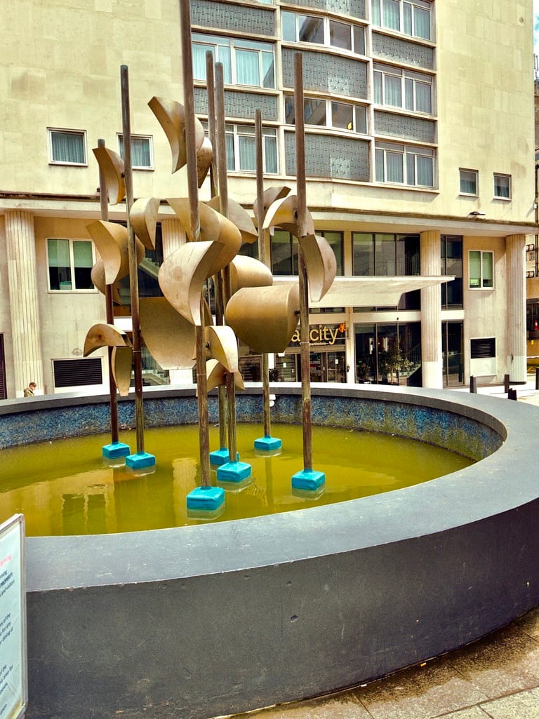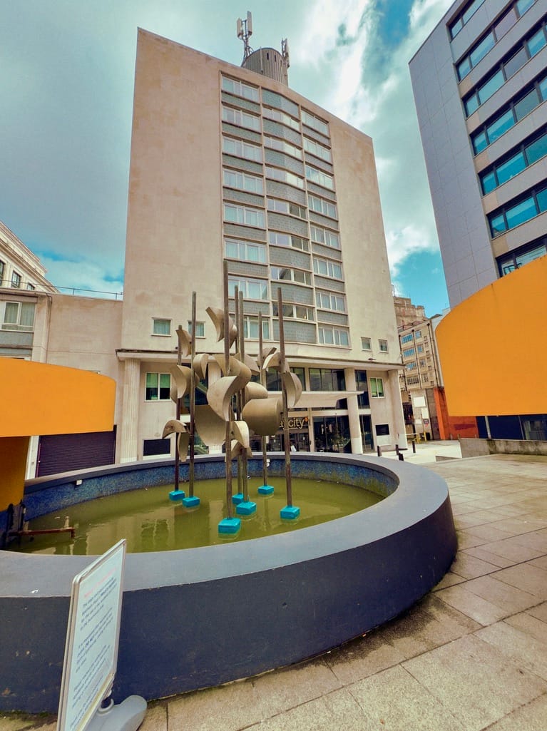 Now residential Wilberforce House and its Piazza Waterfall (Bucket Fountain) with StayCity ApartHotel opposite
