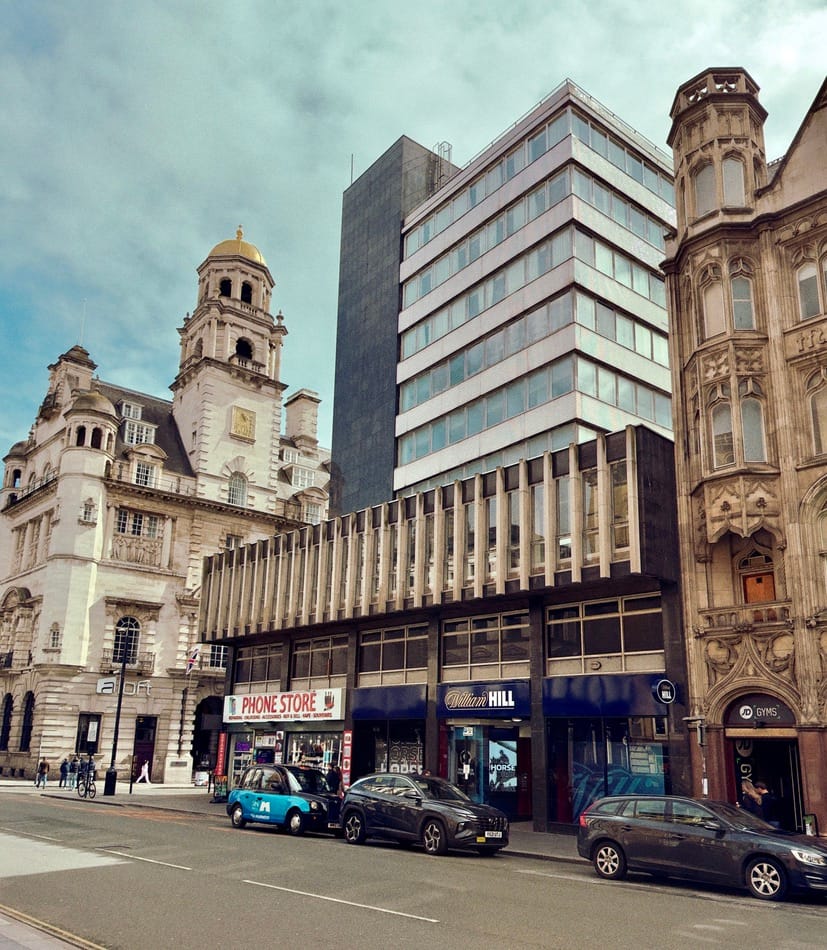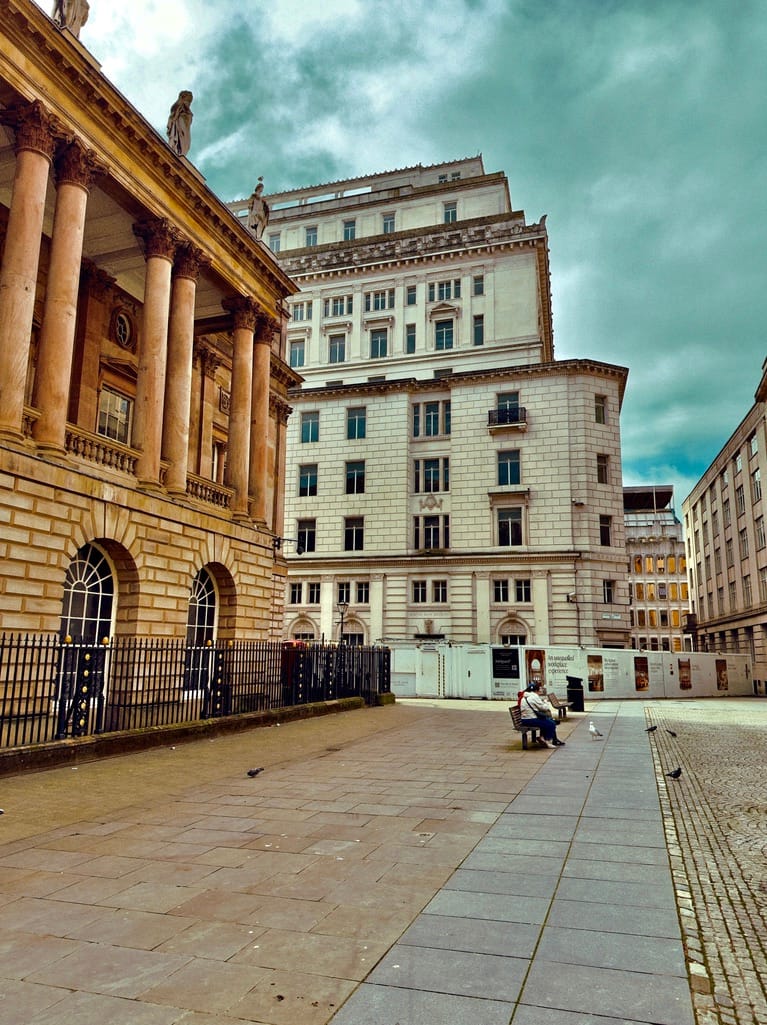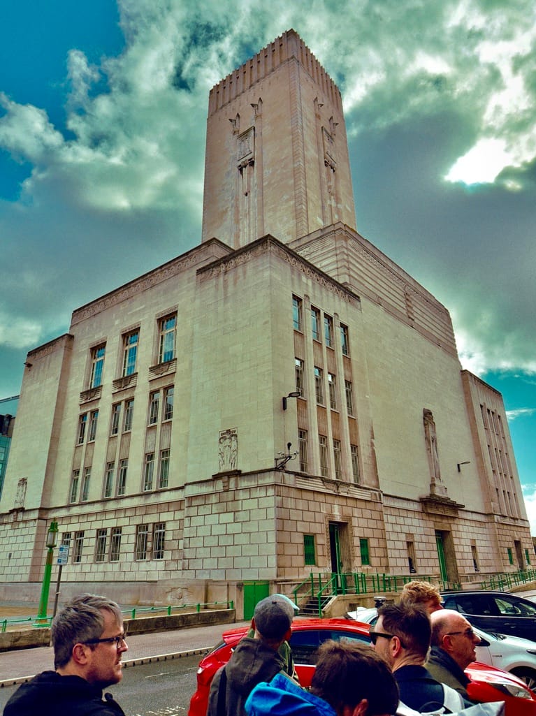 Liverpool Town Hall (left) on Exchange Square, dominated by Walker House | Dale Street corner, the Queensway Tunnel directly below