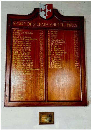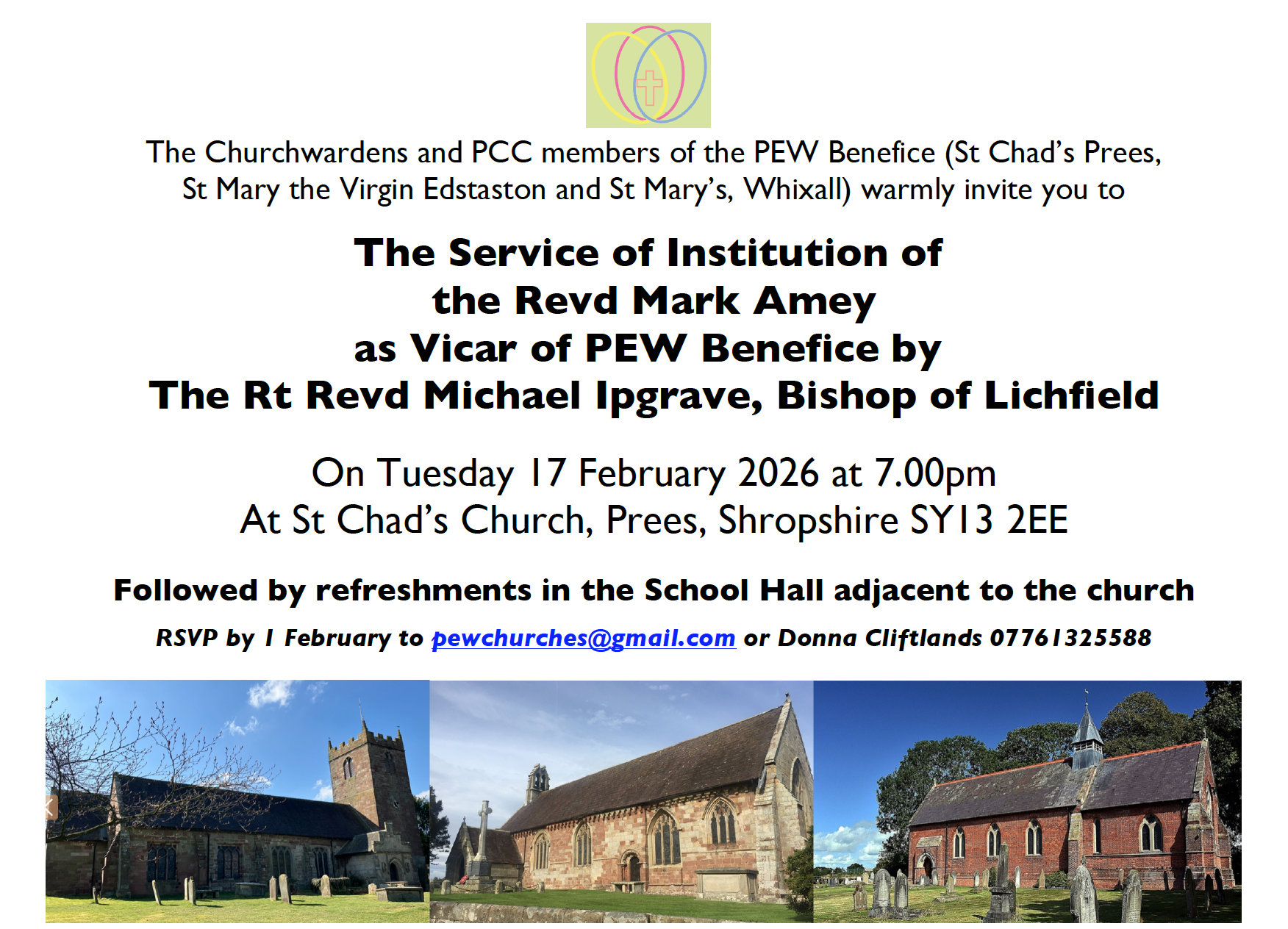 The historic and beautiful Church of St Chad’s is largely 14th-century but is built on a Saxon site; it has an 18th-century tower and contains a notable window made up of fragments of medieval glass brought to Prees from the site of the Battle of Shrewsbury, 1403. The church is Grade 2* listed. St Chad’s is part of the PEW group of churches in North Shropshire - working together with St Chad’s Prees and St Mary the Virgin Edstaston. We are delighted to say that our new Vicar, Revd Mark Amey, will be in post from 17 February. ................... We are occasionally live streaming some of our services on Facebook (http://www.facebook.com/pewchurches), uploading them afterwards on our YouTube channel https://www.youtube.com/channel/UCZh4Q1jD0dFPNwMTJ86UtmA) but most services are now ‘in-person’. THE COMING WEEKS IN PEW: All the following are joint services for the whole benefice and all are welcome! Sunday 18 January 11.00am: Week of Christian Unity: Family Worship: St Chad’s Church, Prees (10.45 for crafts and refreshments; service starts at 11.00) Sunday 25 January 11.00am: Conversion of St Paul: Holy Communion St Mary’s, Whixall Sunday 1 February 11.00am: Candlemas: Holy Communion: St Chad’s Church, Prees Sunday 8 February 11.00am: Holy Communion: St Mary the Virgin Edstaston Sunday 15 February 11.00am: Family Worship: St Chad’s Church, Prees (10.45 for crafts and refreshments; service starts at 11.00) Tuesday 17 February 7pm: The Service of Institution of Revd Mark Amey as Vicar of the PEW Benefice: St Chad’s Church, Prees If you wish to book a wedding or baptism, please email enquiries to pewchurches@gmail.com and we will get right back to you! +++++++++ The Church and churchyard, vicarage and school are nestled together by the War Memorial and garden on the edge of the village of Prees and form a picturesque area within the village. The parish of St Chad’s Church covers the villages of Prees, Higher Heath and Prees Green as well as some surrounding farms and cottages. There are 35 on the electoral roll. There is an enthusiastic team of bell ringers, who ring most Sundays and for weddings, and worship is enriched by a wonderful organ, which is kept in good repair. Services vary from week to week, in a regular pattern, offering opportunities for varied worshiping styles. In normal times services are followed by tea, coffee and biscuits, giving the congregation time to meet and get to know one another. These times have proved invaluable in achieving a sense of oneness in the congregation and an opportunity to welcome visitors in a relaxed way. Social activities are organised throughout the year, not just to raise money but to allow the community to meet together and usually eat together! Prees congregation members also offer a Self Support in Bereavement Group which meet monthly for outings and company, and St Chad’s Ladies also meet monthly for friendship and outings. The PCC has a 100 Club to raise money for the upkeep of the churchyard and Church building, which is appreciated as an asset in the whole community. The response has been encouraging and assures us that people appreciate and support ‘their’ church, even though they may not be regular worshippers. The parish of Prees: St Chad is committed to the safeguarding of children, young people and adults. We follow the House of Bishops’ guidance and policies and have our own Parish Safeguarding Officer: B.Hodges: 01948 840644. The Diocese of Lichfield’s safeguarding pages contain vital links and information including contacts for the Diocesan Safeguarding Advisor (DSA) who advise our PSOs. If you are concerned that a child or adult has been harmed or may be at risk of harm please contact the DSA: 01543 221105 or 01543 306147 during office hours or 030 3003 1111 opt2 for weekend and out of hours. If you have immediate concerns about the safety of someone, please contact the police Protecting Vulnerable People (West Mercia Police): 0300 333 3000 and your local authority Children or Adults Services: 0345 678 9021: out of hours: 0345 678 9040