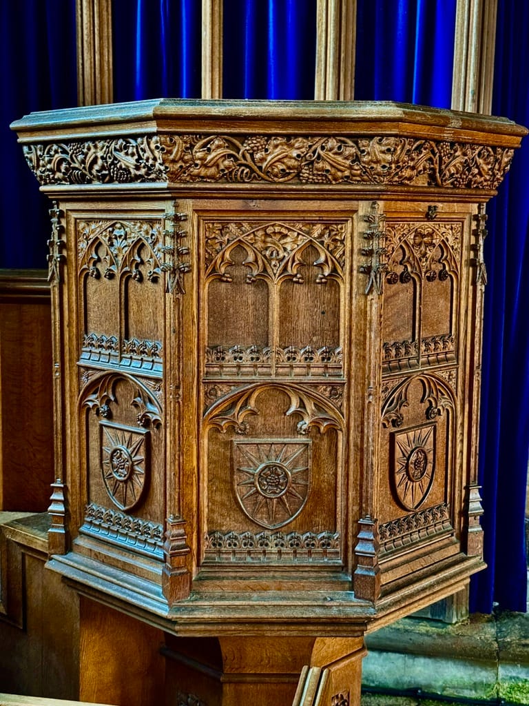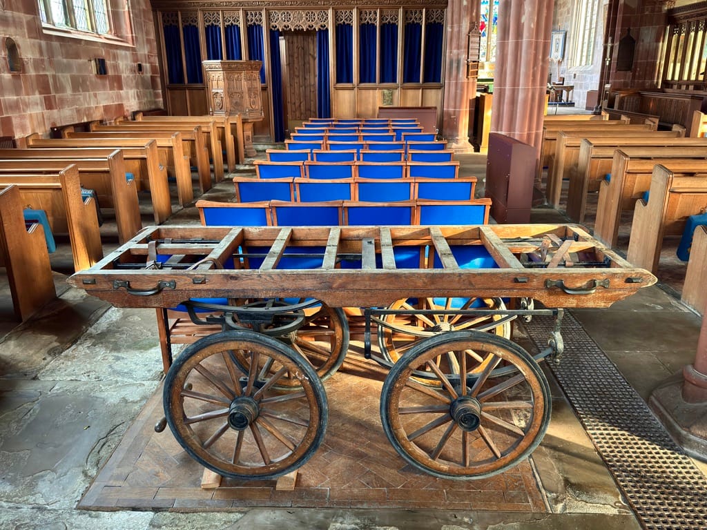 The beatiful carved pulpit | Incumbants list | Coffin wagon trailer | View along the Nave.